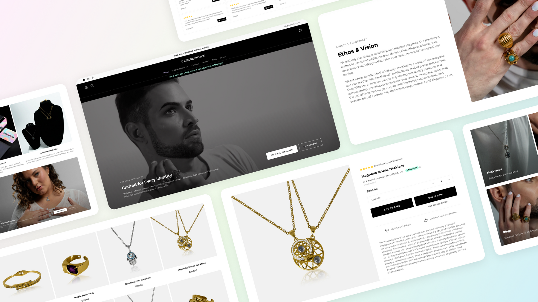 I designed and developed a luxurious and inclusive Shopify store for Stroke of Luck, a premium jewellery brand. Using Figma and Shopify Theme Customisation, I designed a visually stunning, high-converting site that highlights the brand’s gender-neutral and disability-friendly collection.